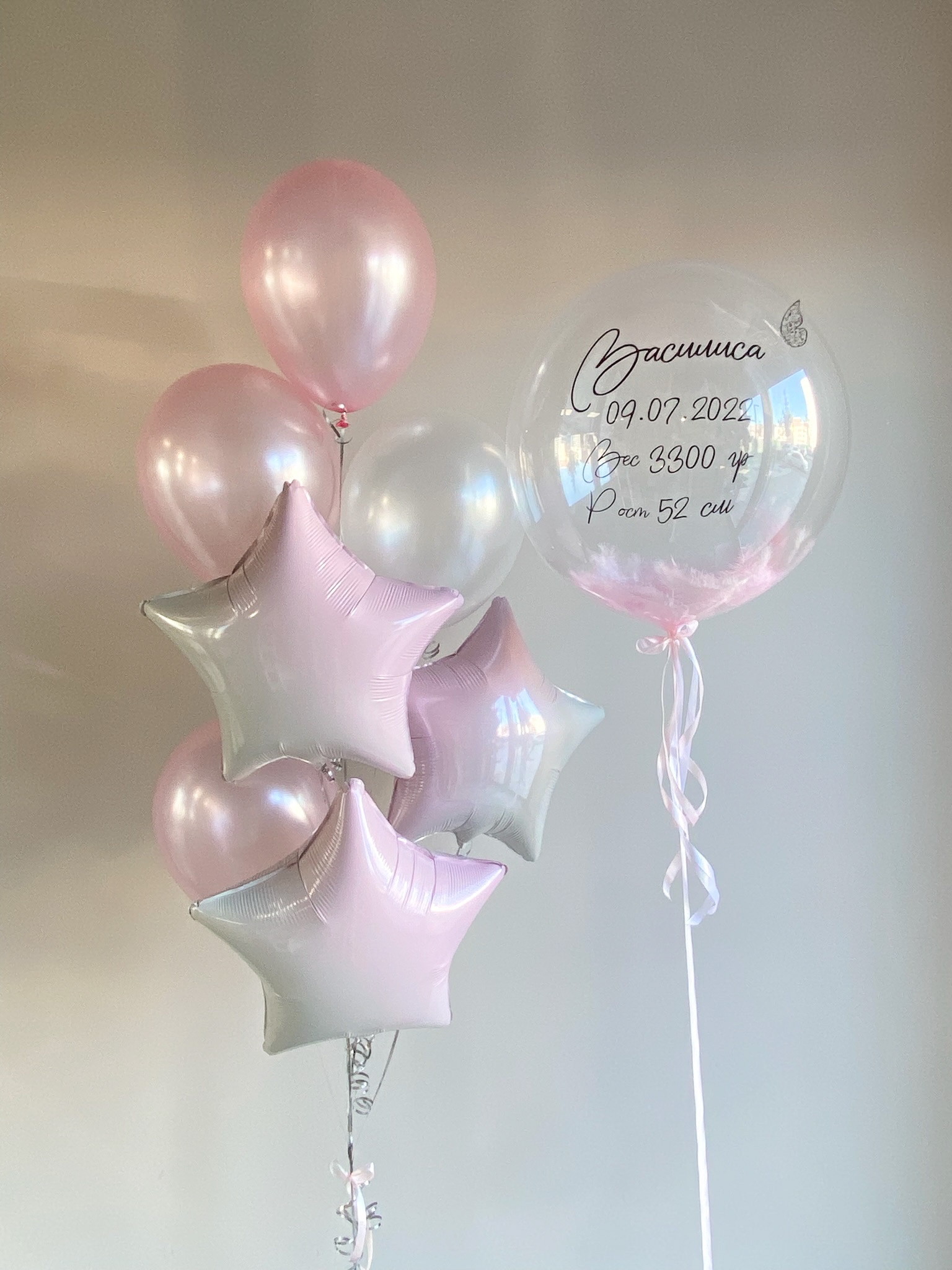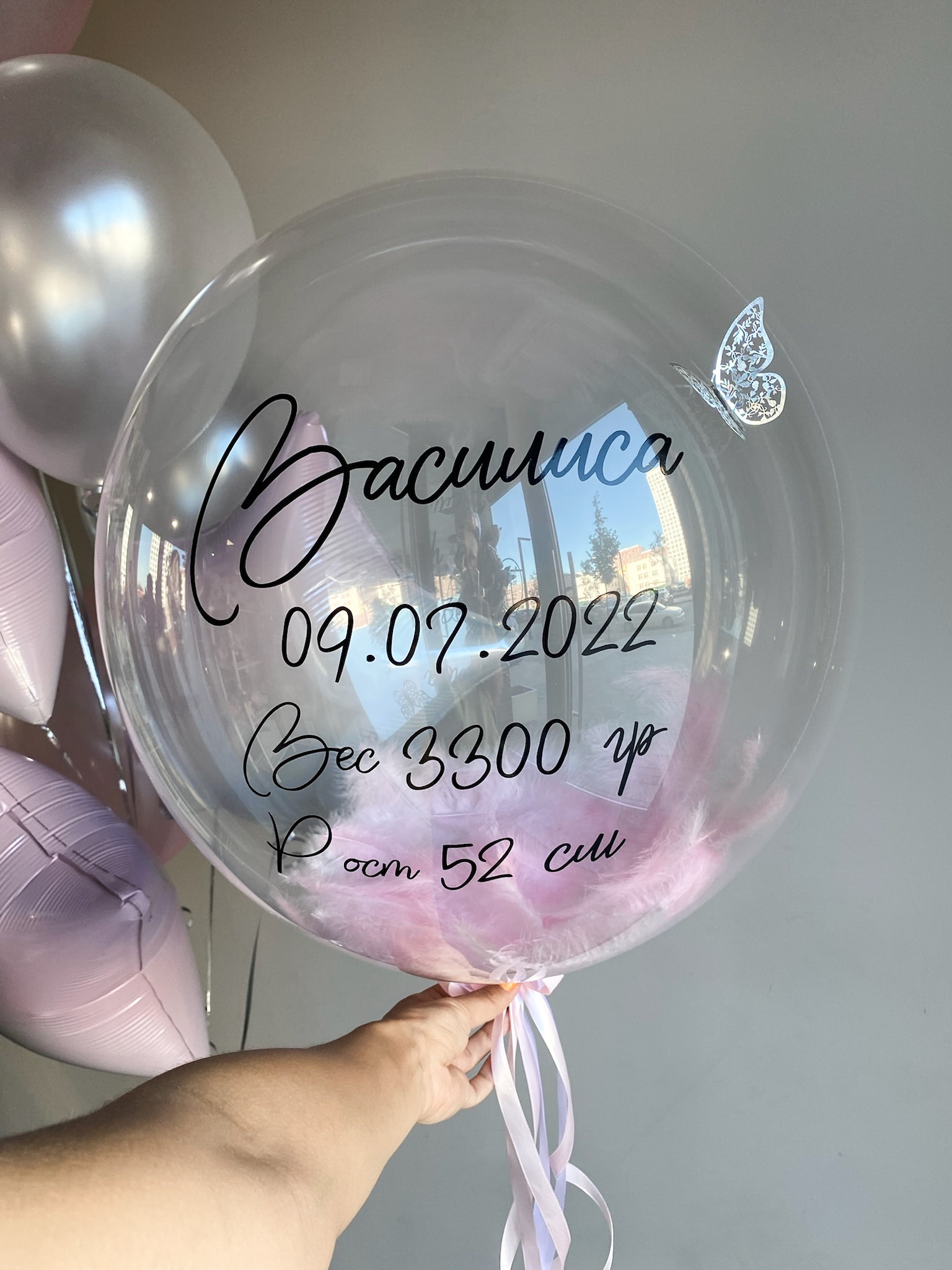 • Бабл с перьями внутри и надписью, также на шар добавлены бабочки