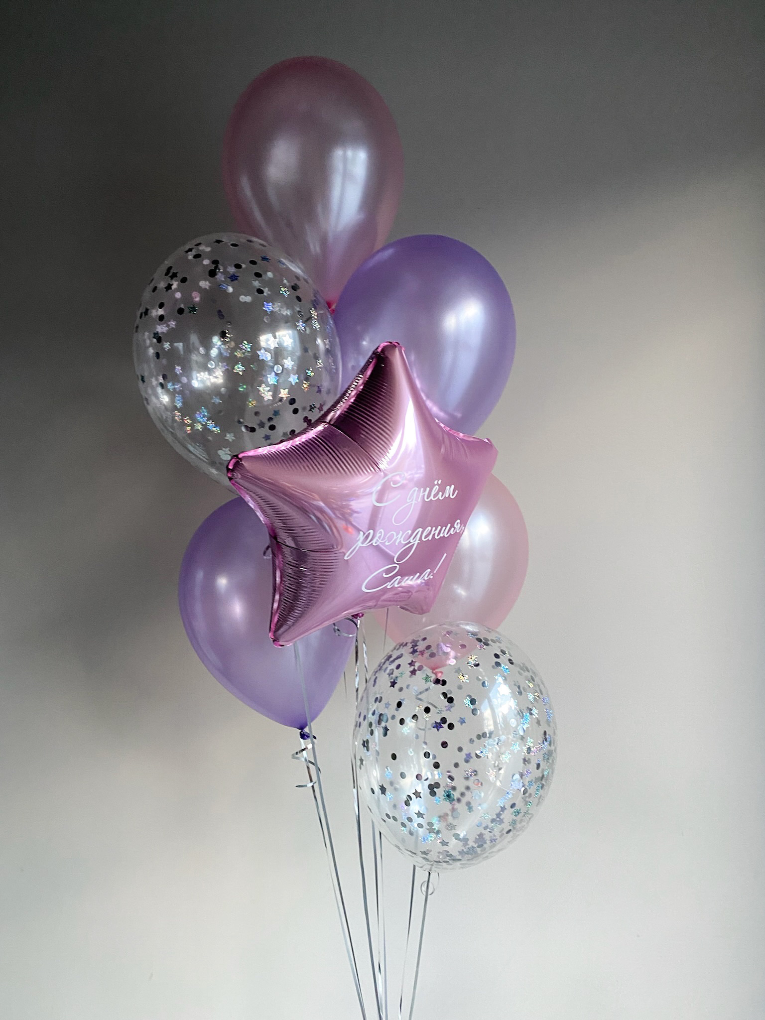 - Фонтан из 8 шаров: звезда с надписью, 2 с конфетти и 5 однотонных
