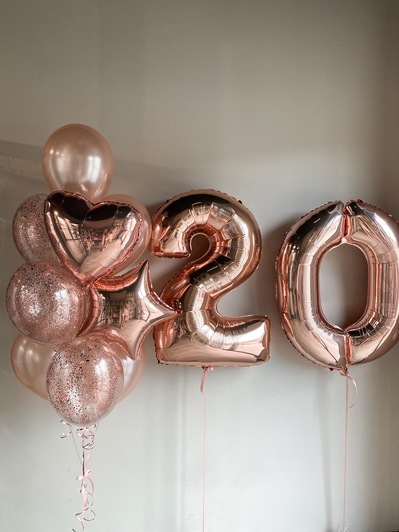 - Фонтан из 10 шаров: звезда, сердце, 3 с конфетти, 5 однотонных