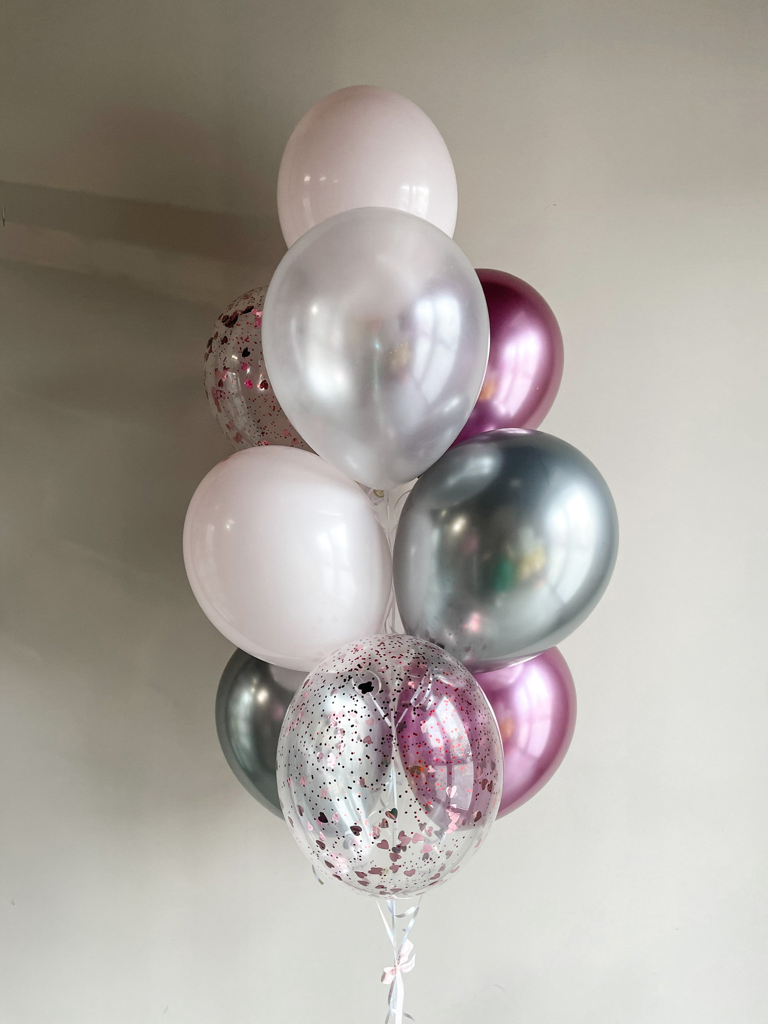 - Фонтан из 10 шаров: 2 с конфетти, 4 хром и 4 однтонных