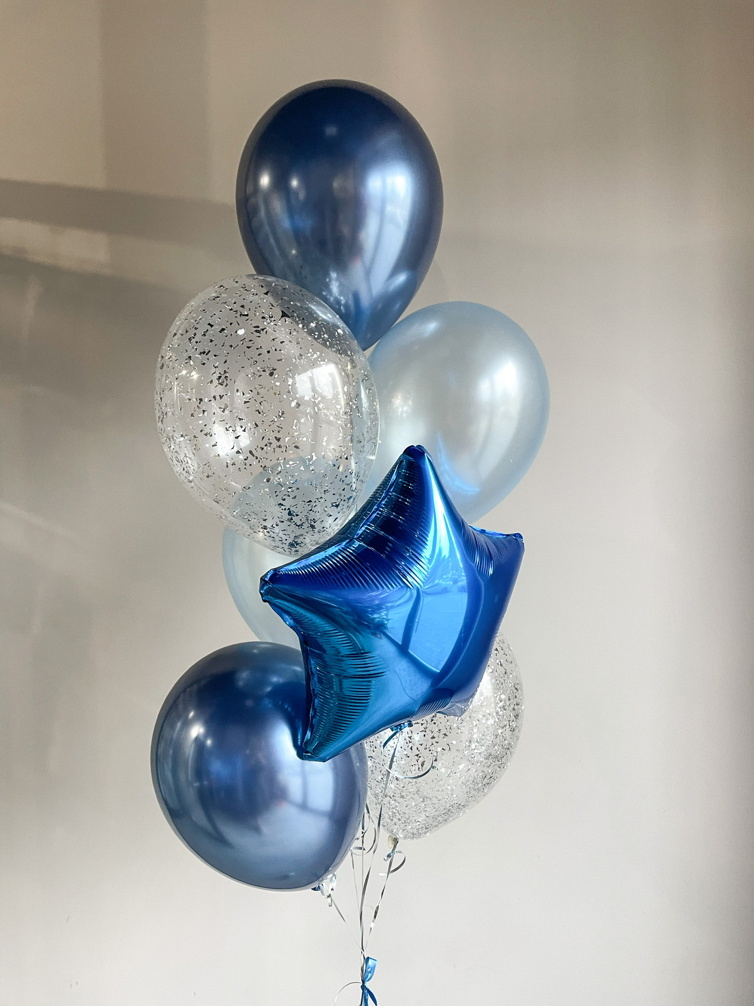 - Фонтан из 7 шаров: звезда, 2 с конфетти, 2 хром и 2 однотонных