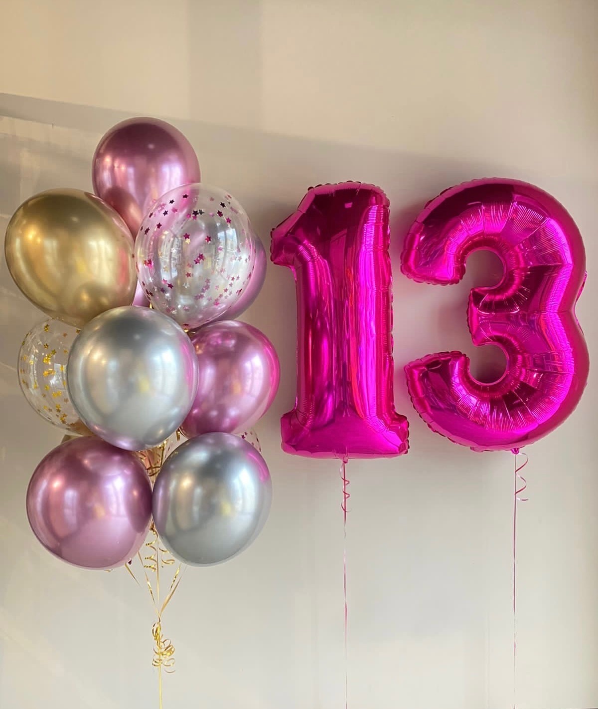 - Фонтан из 13 шаров: 3 с конфетти и 10 хром