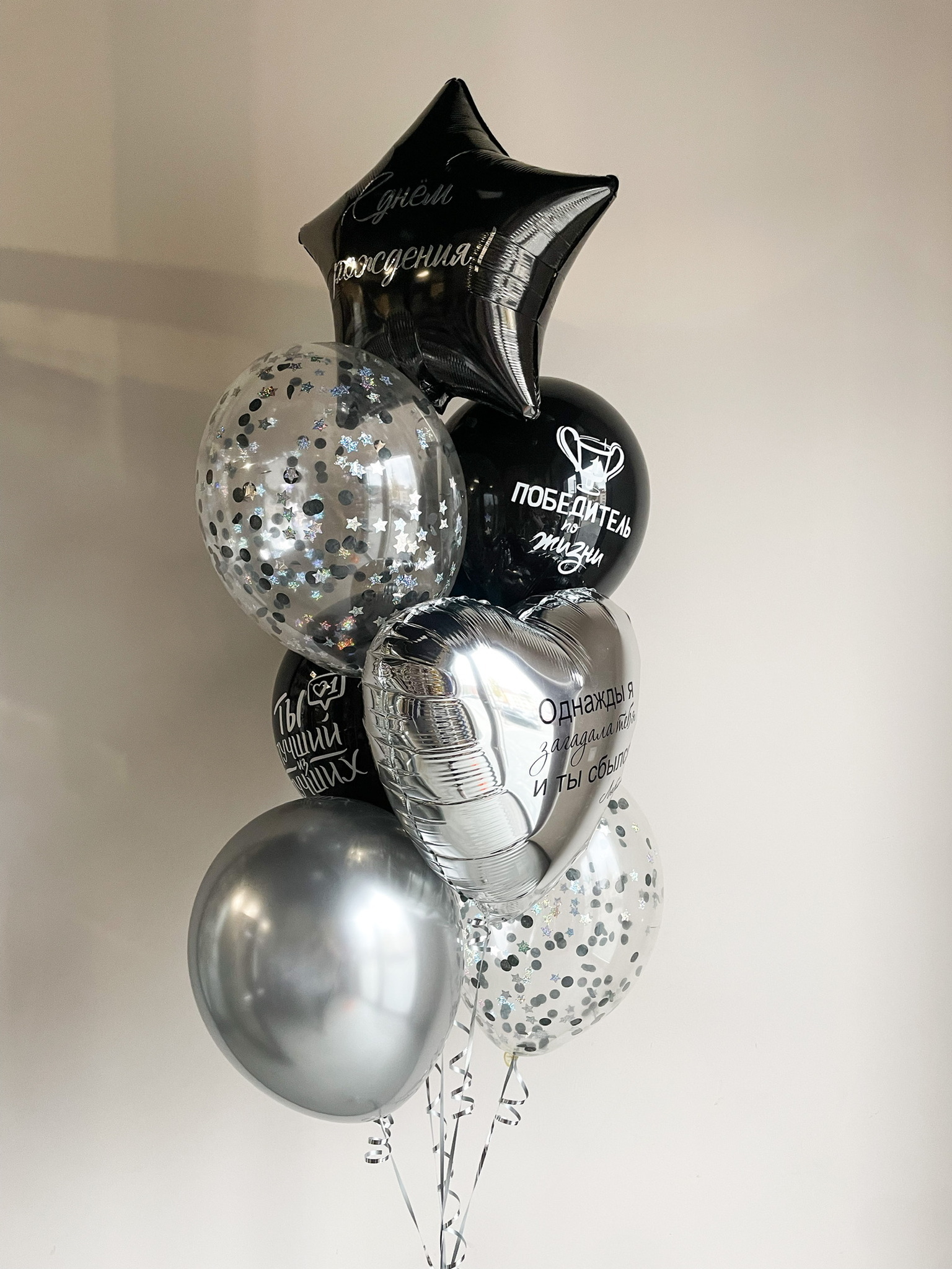 - Фонтан из 7 шаров: сердце с индивидуальной надписью, звезда с индивидуальной надписью, 2 с надписями, 2 с конфетти и 1 хром.