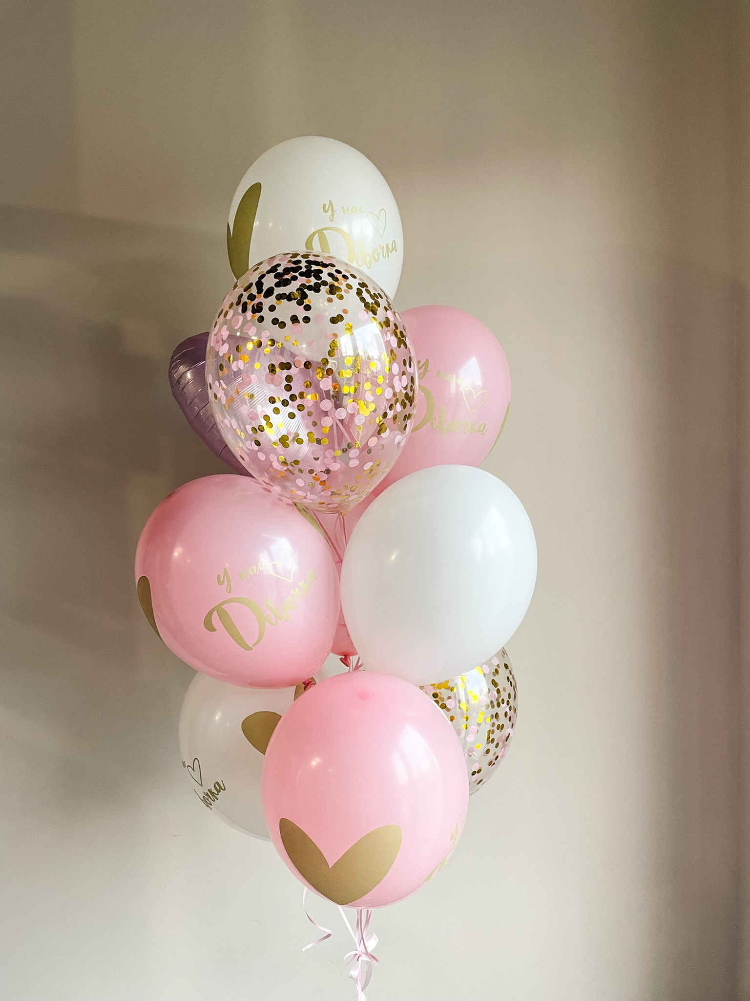 - Фонтан из 10 шаров: сердце, 2 с конфетти, 5 с рисунком и 2 однотонных
