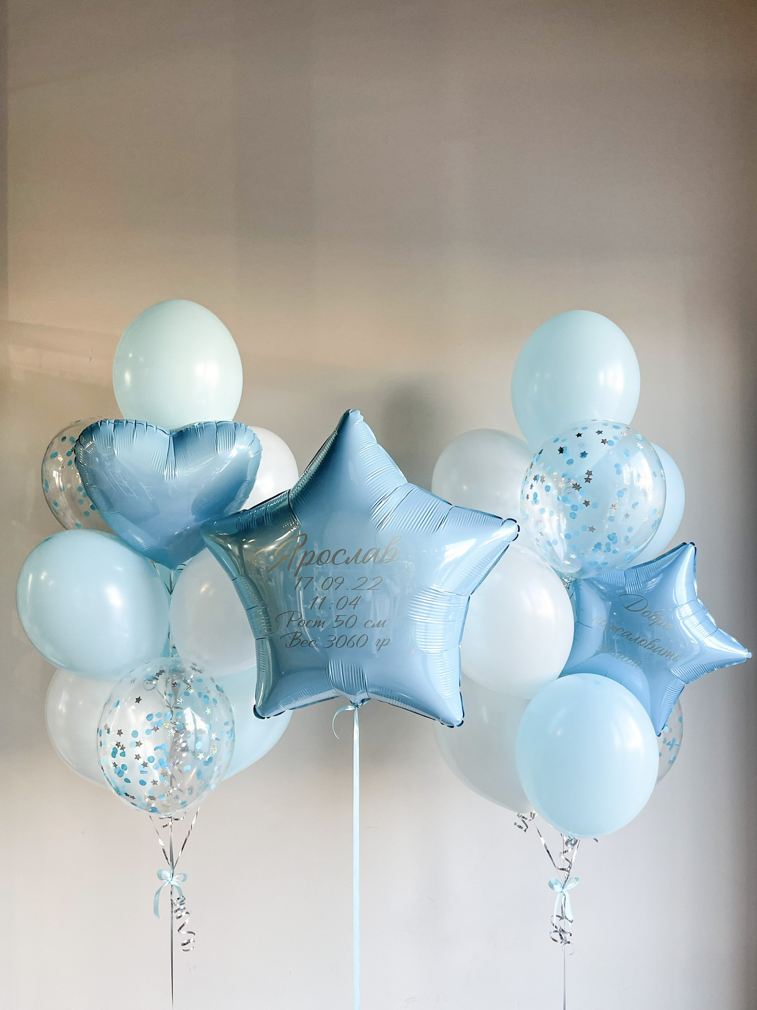 • Два фонтана по 10 Шаров (сердце/звезда, 2 прозрачных с конфетти, 4 голубой макарунс, 3 белых)