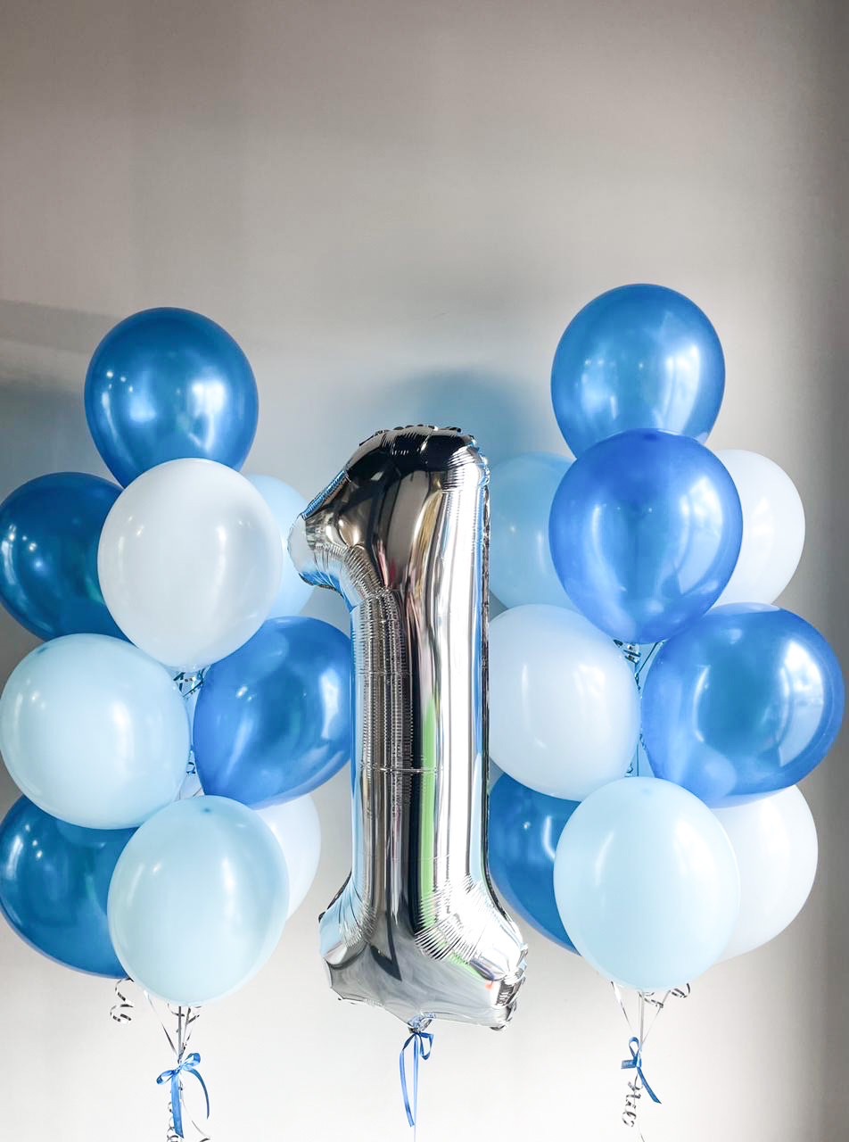 • Два фонтана по 10 Шаров (4 синий перламутр, 3 голубой макарунс, 3 белых)