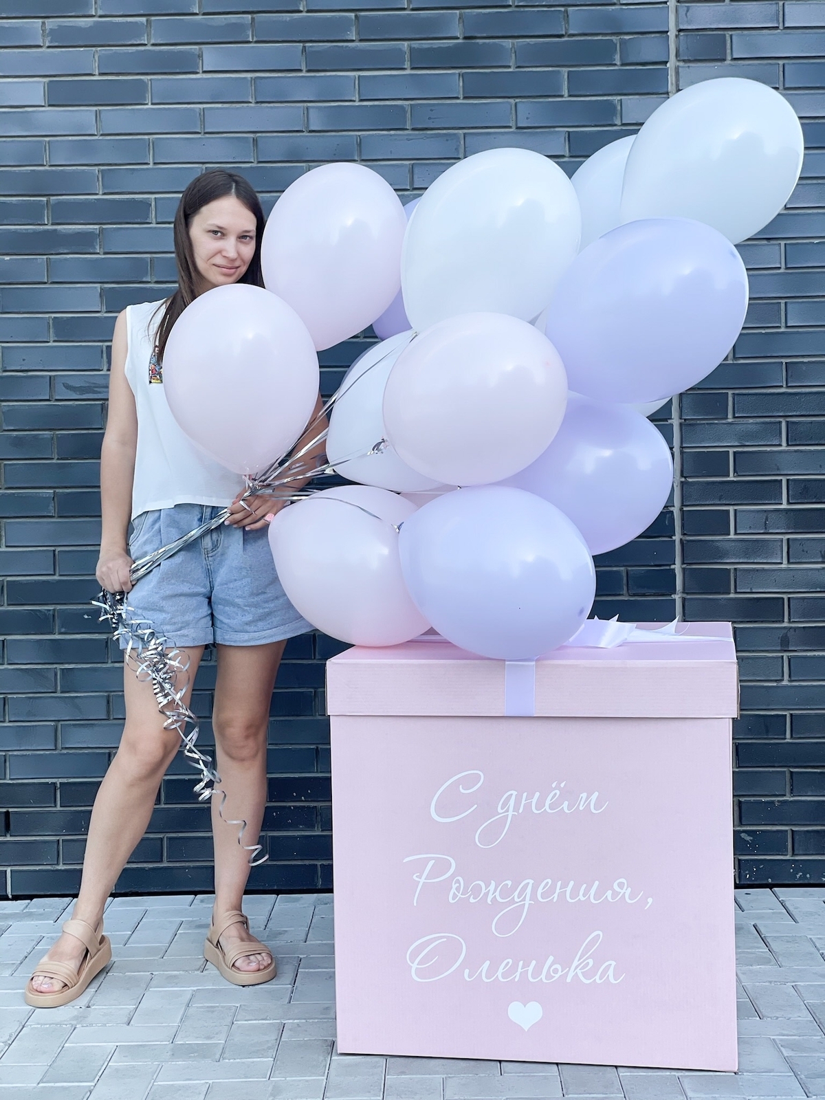 10 шаров и коробка с надписью и бантом