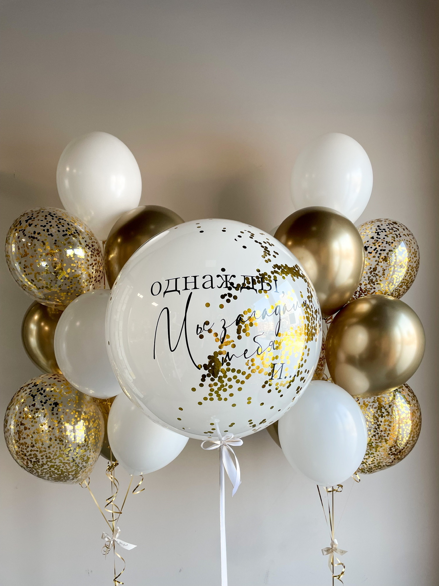 • Два фонтана из 10 шаров: 3 с конфетти, 3 хром золото, 4 белых