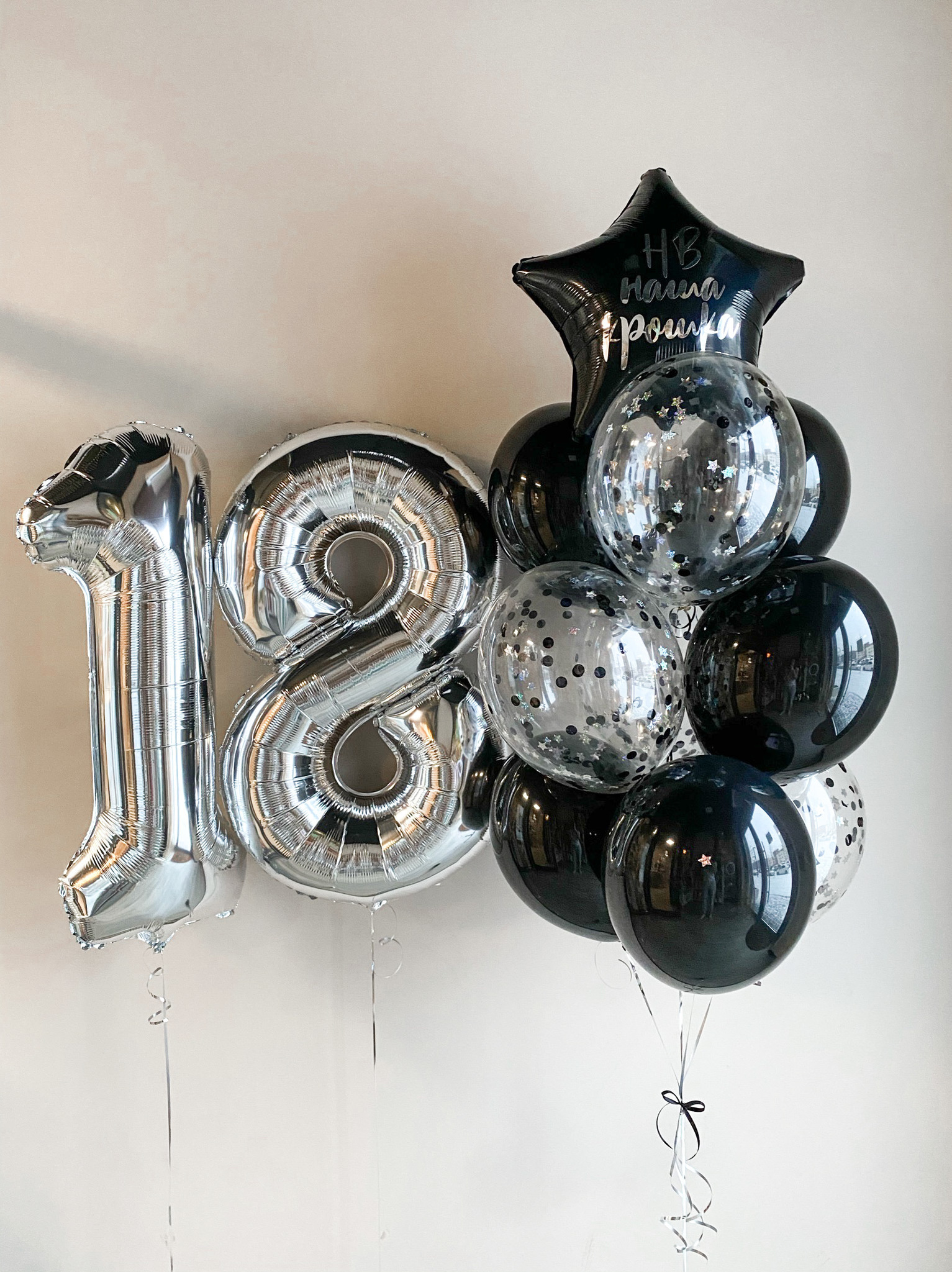 - Фонтан из 10 шаров: звезда с надписью, 4 с конфетти, 5 однотонных.